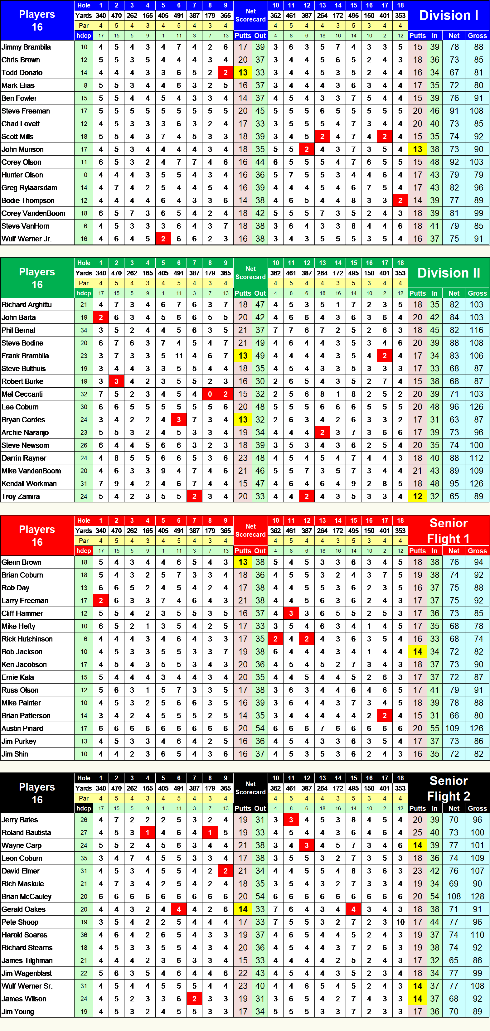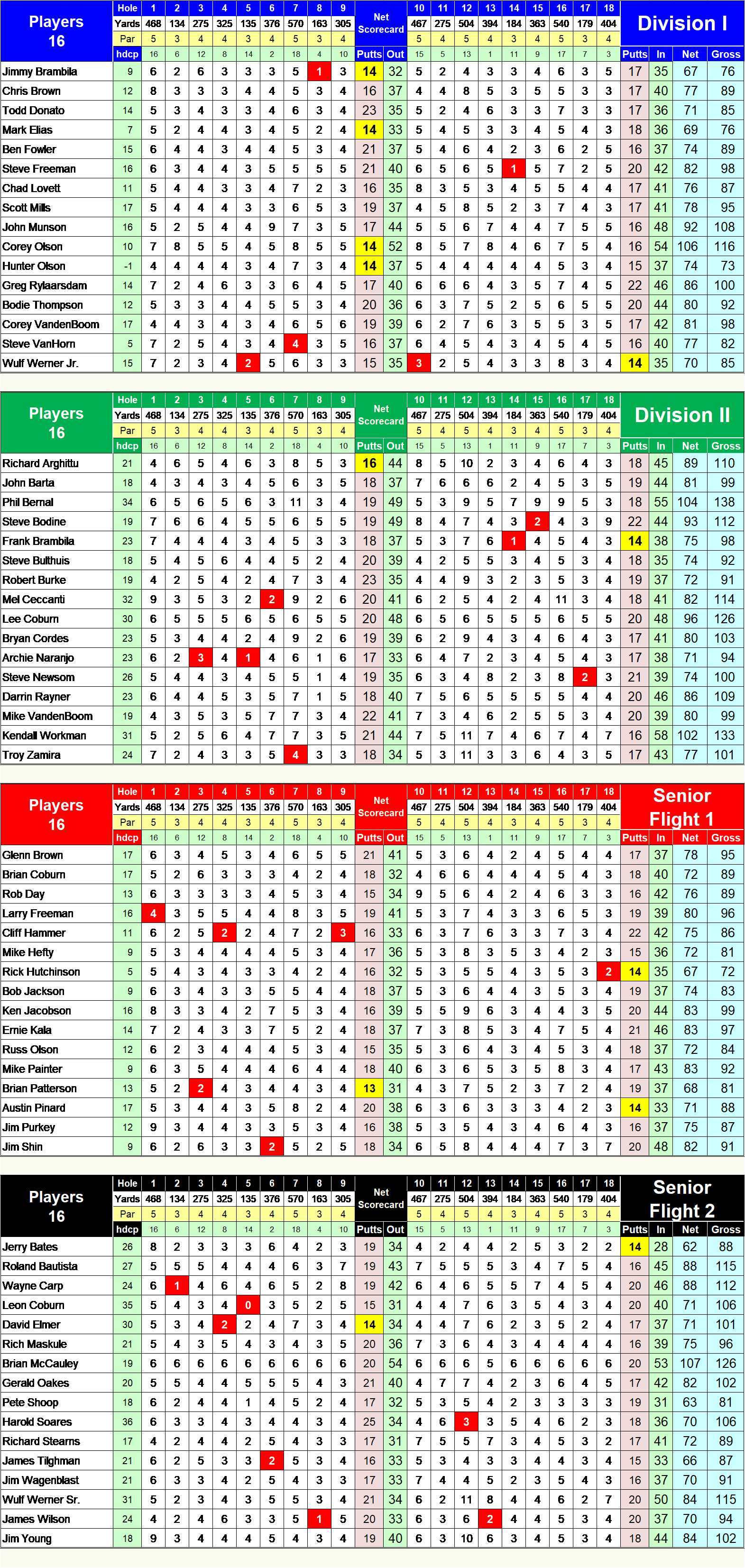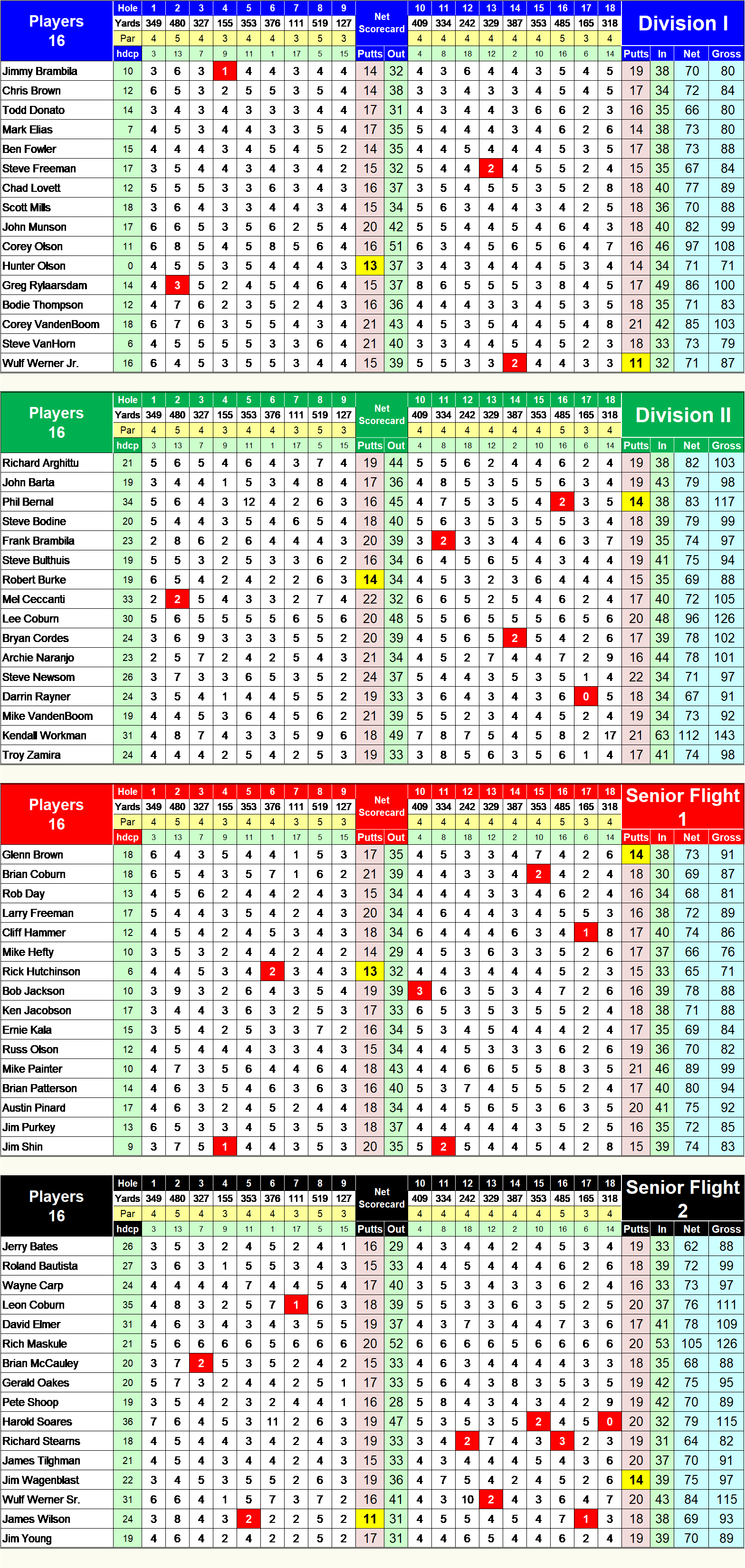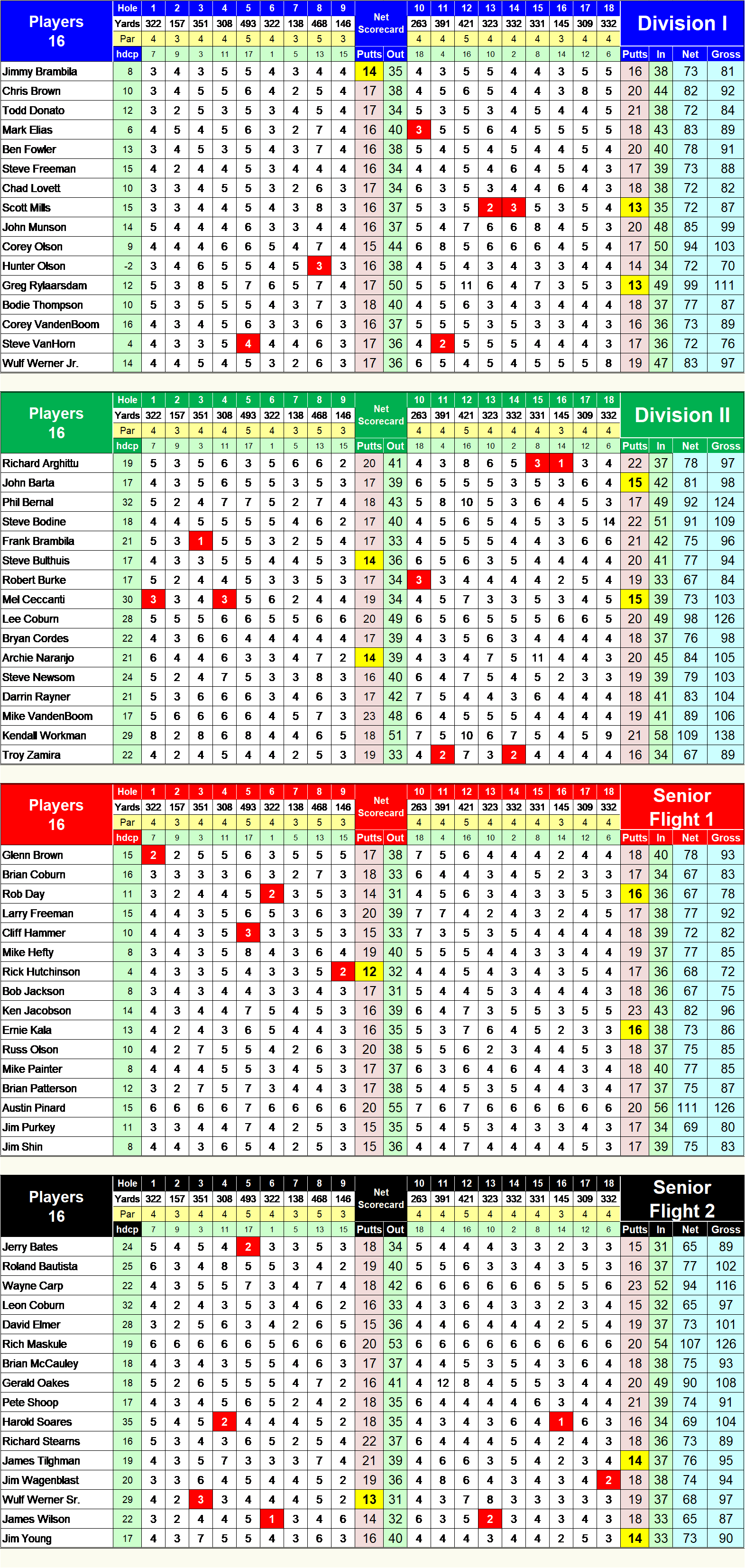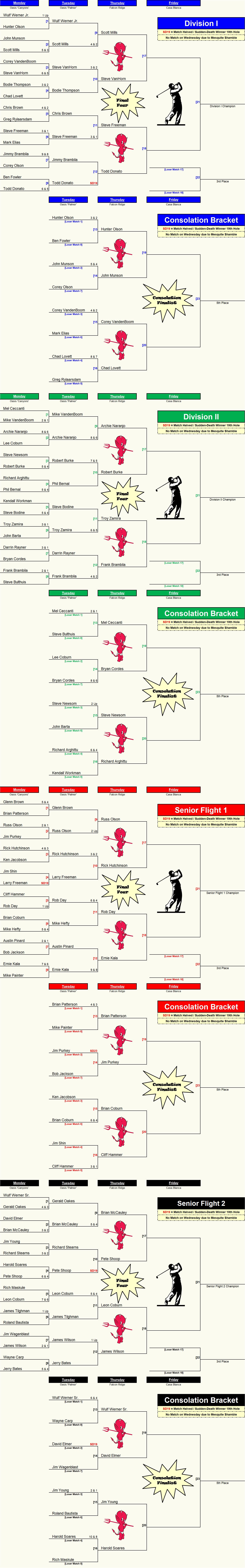 Divisions I & II - White Tee Box - 5819 yards - 68.7/125 Senior Flights I & II - Gold Tee Box - 5354 Yards